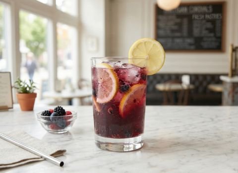 Iced Tea Version: Brew 1 cup of black tea or herbal tea and let it cool. Mix ¼ cup of blueberry lavender syrup into the cold tea. Add ice, fresh blueberries, and lemon juice. Skip the carbonated water to keep it smooth and simple. This version tastes more like tea with fruit flavors.