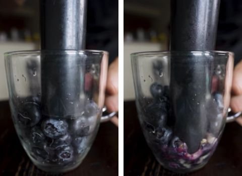 - Take 1 1/2 cups fresh or frozen blueberries and place them in a bowl. Mash them with a fork or potato masher until they turn into a thick, juicy mixture. Small chunks are perfectly fine. If using frozen berries, thaw them first.