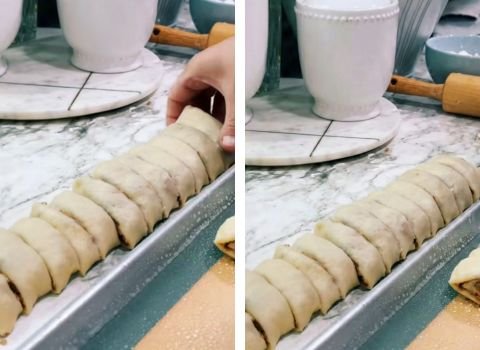 - Using a sharp knife, cut the roll into pieces about two inches wide. Place each piece on a parchment-lined baking sheet, leaving space between them. Repeat with the second half of the dough.