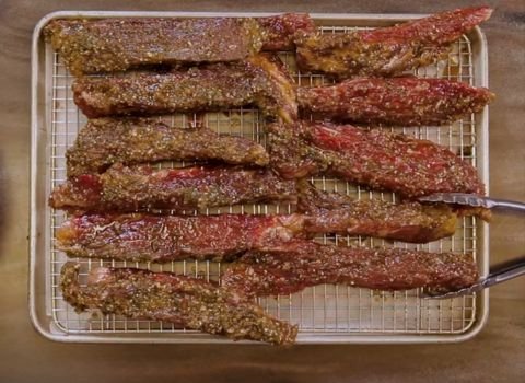 Lay the beef strips on the rack, spacing them evenly. Sprinkle the strained solids over the beef. Bake for 1¼–1½ hours, until the internal temperature reaches 150°F. Let cool for 10 minutes.