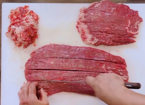 Both cuts should be sliced against the grain. This means you cut across the long lines in the meat. It makes your pipikaula much more tender to eat.