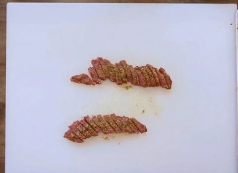 Slice the steak into long strips about 1½ inches wide, trying to keep the pieces as even as possible.