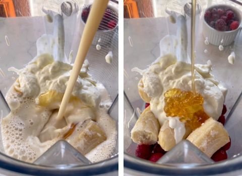 Add the ½ cup of full fat yogurt next. Pour in 1 tablespoon of raw honey. Finish with 1 cup of milk. Adding the liquid helps the blender run smoother.
