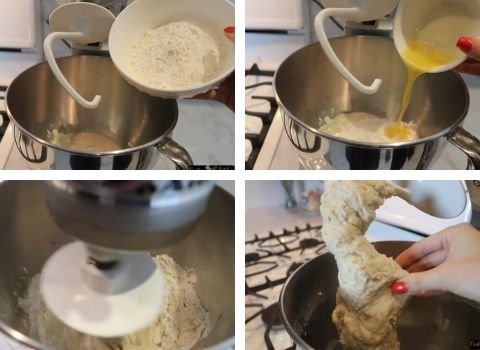 Pour the bubbly yeast mixture into a stand mixer bowl. Add the bread flour, all-purpose flour, salt, and melted butter. Attach the dough hook and mix on low speed for 5 – 7 minutes.