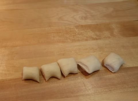 Punch down the dough and turn onto a clean counter. Divide into 4 pieces. Roll each piece into a ¾-inch thick rope and cut into 1½-inch pieces, discarding tapered ends.