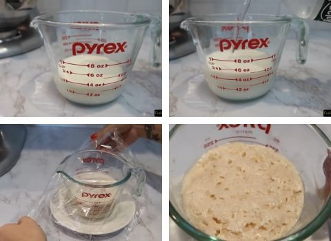 Cover with plastic wrap and let sit for 10 minutes. Bubbles forming on the surface mean your yeast is active.